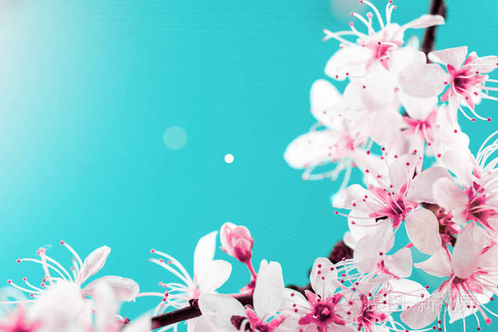 四月花的自然 春暖花开五月花蔚蓝 为横幅 背景是樱花的枝桠 梦幻浪漫的形象 景观全景 复制空间 照片 正版商用图片2cyezp 摄图新视界